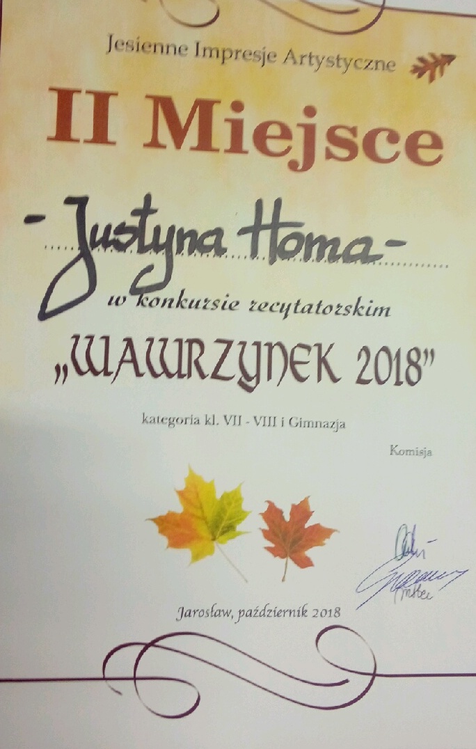 Konkurs „Wawrzynek” od wielu lat cieszy się wielką popularnością. Obejmował on recytację jednego utworu, tematem i nastrojem nawiązującym do jesieni. Nasza szkoła co roku uczestniczy w prezentacjach. Poziom konkursu był wyrównany, ponieważ recytatorzy solidnie przygotowali się do występów.