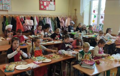 W ramach prozdrowotnej akcji ,,Jedz zdrowo i kolorowo" uczniowie z klasy 1b robili podczas zajęć owocowe szaszłyki. Wszystkim wyszło pyszne, zdrowe i kolorowe drugie śniadanie.