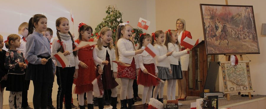 Po zakończeniu Mszy najstarsza młodzież wróciła na lekcje, gdzie czekała na nich piosenka patriotyczna odtwarzana w naszym radiowęźle, zaś najmłodsze dzieci "Jedynki" odegrały krótkie przedstawienie upamiętniające historyczne wydarzenie, którym od stu lat żyje cała Polska. Wszystkim zgromadzonym występ naszych uzdolnionych dzieci z klas 0 - 2 bardzo się spodobał, a zakończył go niezaplanowany, lecz bardzo efektowny POLONEZ poprowadzony przez dyrektora Olafa Pokrywkę oraz Królową Jadwigę, w którą wcieliła się Martyna Brzana.
