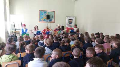 Dzisiaj, po raz ostatni już w tym roku szkolnym gościliśmy muzyków z Mobilnej Filharmonii. Wysłuchaliśmy premierowego koncertu "W muzycznej podróży świat nie jest zbyt duży", podczas którego nie tylko raczyliśmy się piękną muzyką, ale również odkrywaliśmy nieznane dotąd lądy i kultury. Dziękujemy pięknie za kolejną lekcję żywej muzyki i czekamy z utęsknieniem na nowy program.